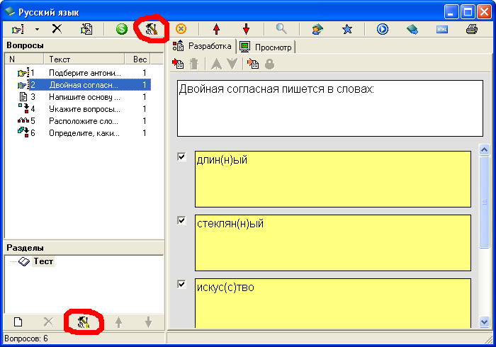 (Редактировать модификаторы вопроса) или клавишу F4. Кроме того, можно настроить режим оценивания сразу для всех вопросов некоторого раздела теста, выбрав его в нижнем списке и нажав кнопку